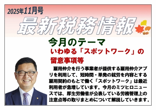 ミツヒロニュース11月号が出来ました。 今月のテーマは、 ◆いわゆる「スポットワーク」の留意事項等 ◆【新設】 フリーレント契約の税務処理について ◆社会保険加入対象の拡大 ◆年末調整のお知らせ ◆あとがき 値上げの秋 となっております。 〈記事のダウンロードは詳しい情報から〉 ↓ ↓ ↓