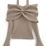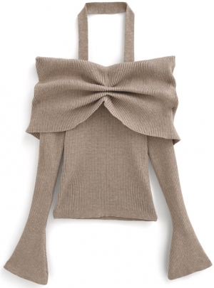 ホルターネックとオフショルダーを大胆に組み合わせた大人っぽいトップスです。リブニットには程よい厚みがあり、適度なフィット感で着心地◎。リボンのようなギャザーデザインとベルスリーブがキュートさとエレガントさを両立。特別なシーンでの着用もおすすめです。